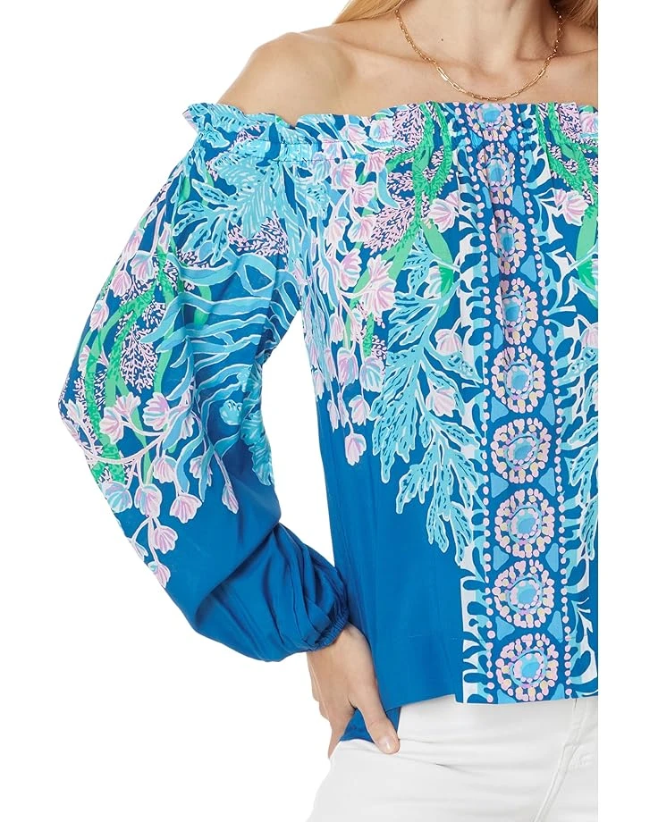 - Discover the Lilly Pulitzer® Aimes Long Sleeve Off The Shoulder Top, a chic fusion of comfort and flair. This relaxed-fit masterpiece features a timeless floral print and an alluring off-shoulder neckline that beautifully accentuates your style. The long sleeves, adorned with elasticized cuffs, add a touch of sophistication, while the small ruffle at the neckline enhances its feminine charm. Easy to pull on and perfect for any occasion, this classic-fit top ensures you look effortlessly polished and feel fabulous all day long.