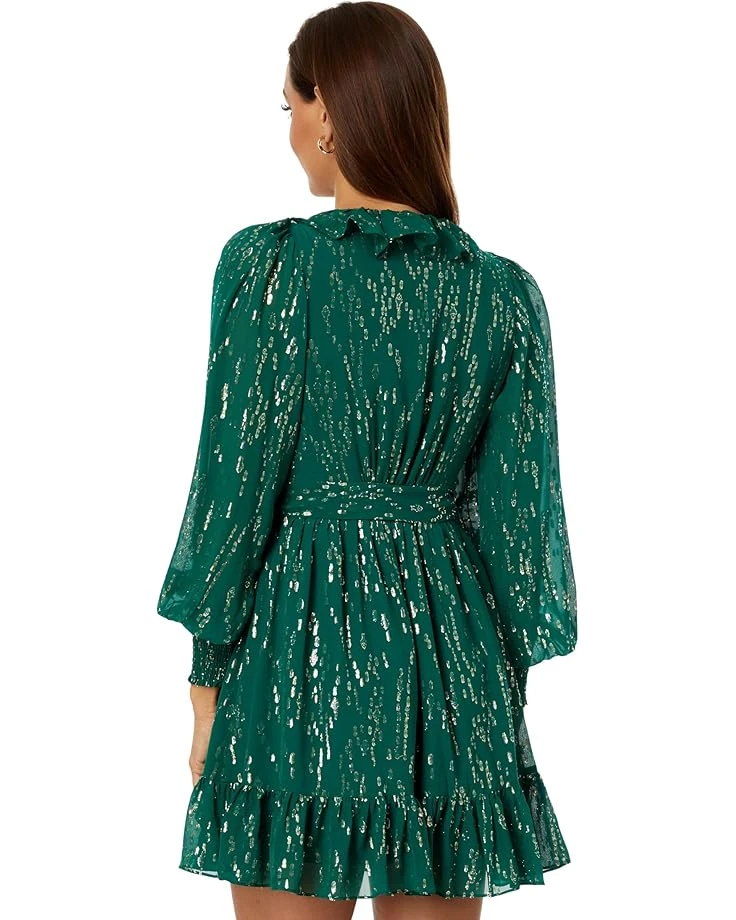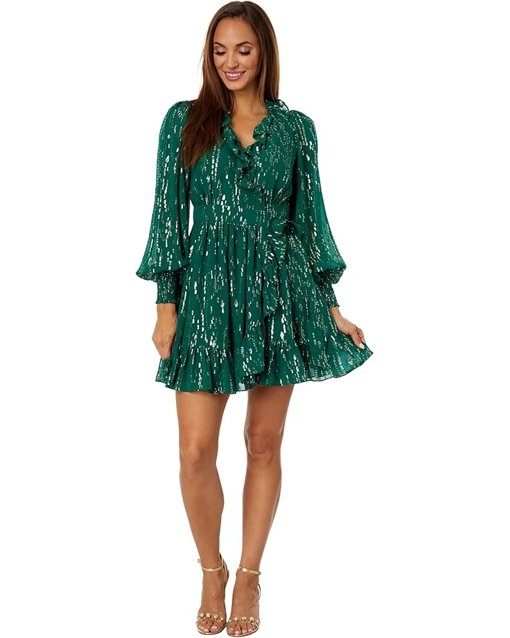 - The Lilly Pulitzer® Birdy Long Sleeve Silk Wr Dress showcases the ultimate expression of style and shimmer sophistication. It features a surplice neckline with ruffled trims and long puffed sleeves accompanying smocked cuffs.