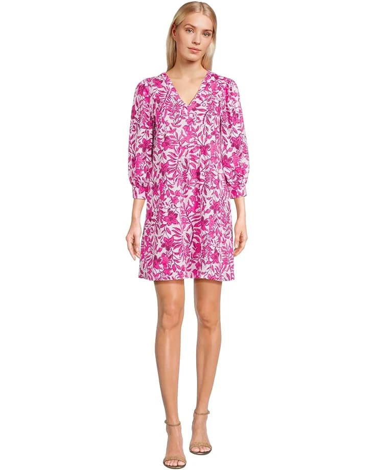 - Bloom into effortless elegance wearing the Lilly Pulitzer® Cass Dress! This above-the-knee floral masterpiece is designed for a breezy, stylish look with an easy fit that flatters every figure. Its chic V-neckline and front yoke detail add a touch of sophistication, while quarter blouson sleeves with cuffs offer a hint of playful charm. Perfect for quick style on-the-go, the pull-on design makes it as practical as it is stunning.