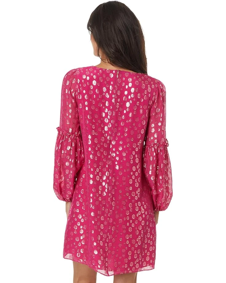 - You’ll be noticed at a party in this Lilly Pulitzer® Cleme Silk Dress with a v-neckline accentuating pintuck details at the front. The long, full sleeves have ruffle details at midway while the gold metallic accents sparkle on the deep green silk fabric. The dress is crafted of silk with metallic fibers, giving it a shiny, soft finish and making it perfect for a festive party.