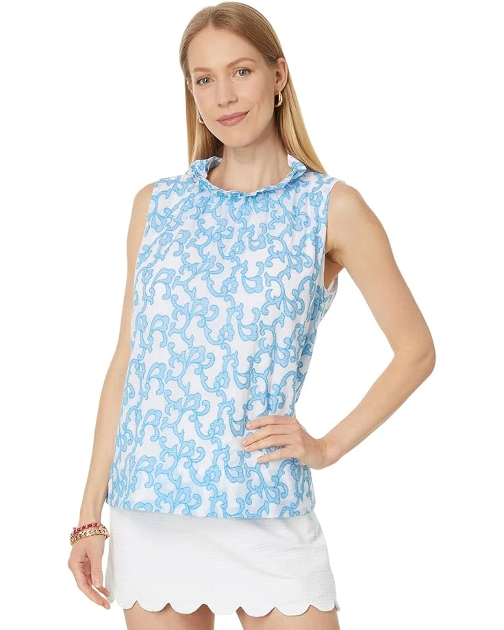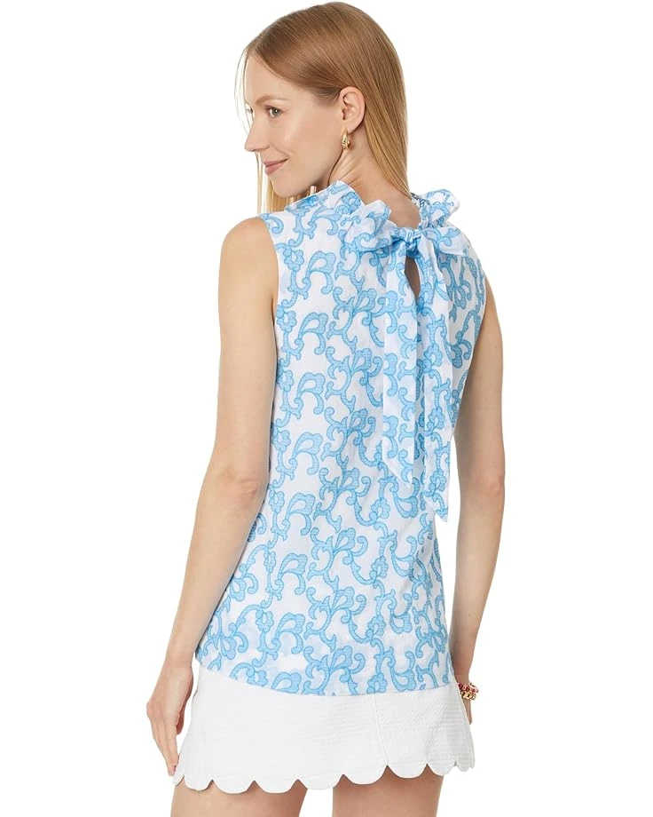 - Exude fashionable vibes while enjoying the soft touch of comfort wearing the Lilly Pulitzer® Dahliana Embroidered Cotton Top. With its easy fit and bra-friendly design, the top is ideal for daily wear. The pull-on style top features a sleeveless design, high ruffled neckline, functional back neck tie, an allover floral print, and a standard-length silhouette.