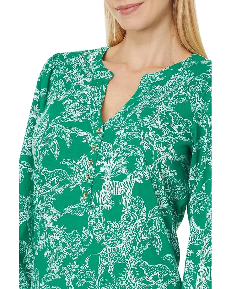 - It’s the ideal blend of laid-back luxury and polished details, the Lilly Pulitzer® Emery Dress. This chic, straight-fit dress features a stylish notch neckline and 3/4 length blouson sleeves, adding a touch of sophistication to your look. Gold buttons along the front placket offer a subtle shine, while the above-the-knee length ensures a flattering, breezy fit perfect for any occasion.