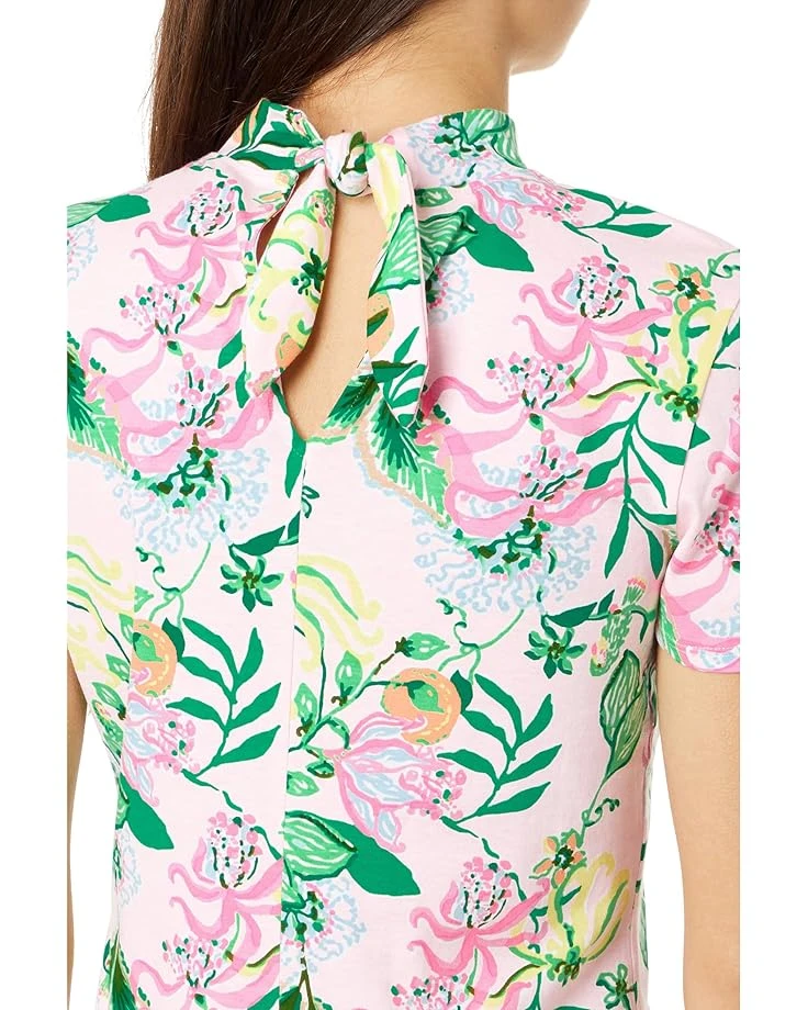 - Bring on a blissful vibe and delight to any occasion wearing Lilly Pulitzer® Hallie Short Sleeve Dress that comes in a fitted construction with an above-the-knee silhouette. The dress features a mock neck, short sleeves, functional back neck tie with slit, and an attractive allover leafy print.