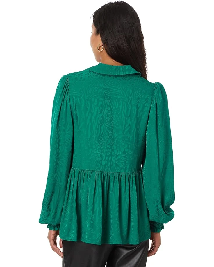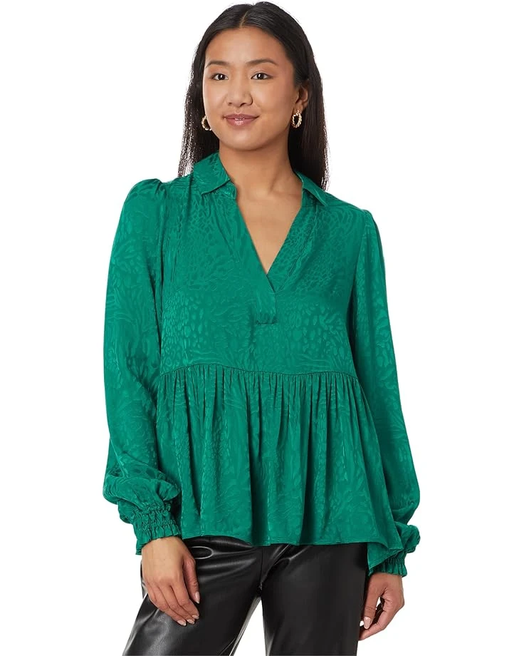 - Indulge in a burst of vibrant elegance with Lilly Pulitzer® Jaylene Long Sleeve Jacqu. Elevate your wardrobe with its easy-fit silhouette, adorned with a chic collar, half placket, and long sleeves with elastic cuffs. The tall hem ruffle adds a playful touch, while its roomier fit gracefully skims the body.