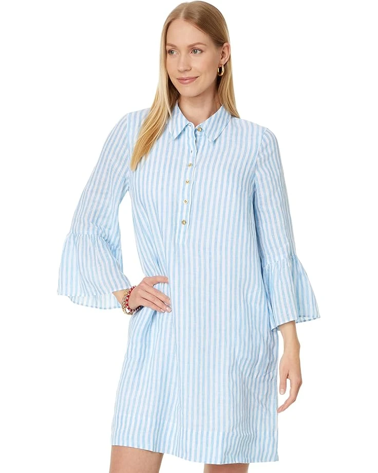 - Flaunt your flowy and fabulous style wearing the Lilly Pulitzer® Jazmyn 3/4 Sleeve Linen Tunic Dress. This easy fit dress features collared neckline with half button placket, three-quarter length ruffle-hem sleeves, two side seam hand pockets, and allover stripe print.