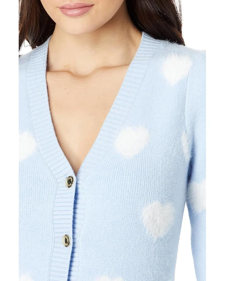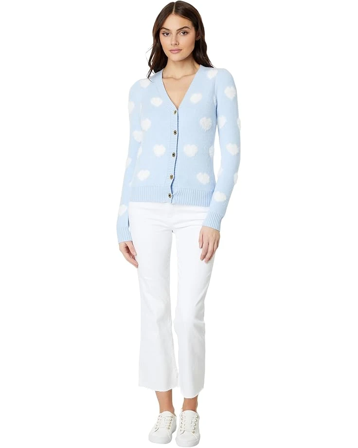 - Embrace the season in comfort wearing the Lilly Pulitzer® Keane Cardigan. This cute sweater features allover heart design, long puff sleeves, classic V-neckline, and five button front closure.