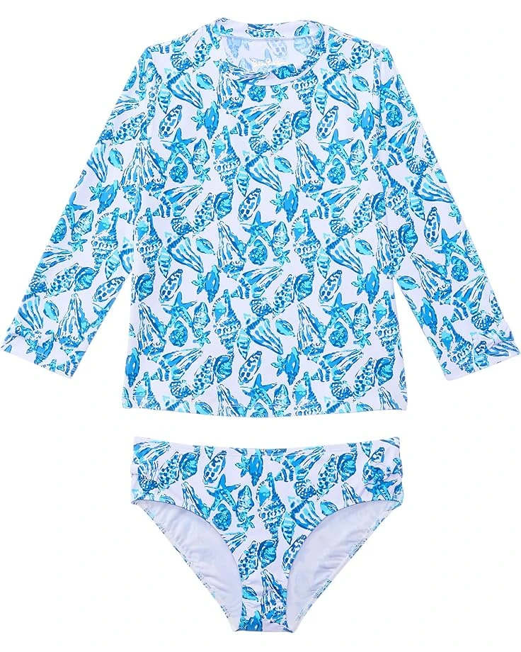 - Stay sun-safe in style adorning Lilly Pulitzer® Kids Bobby Rashguard Set UPF 50! Trendy bow details accentuate long sleeves, offering maximum sun protection. The matching bikini bottom with bows complements the crew neck design, ensuring a fashionable beach day for your little one.