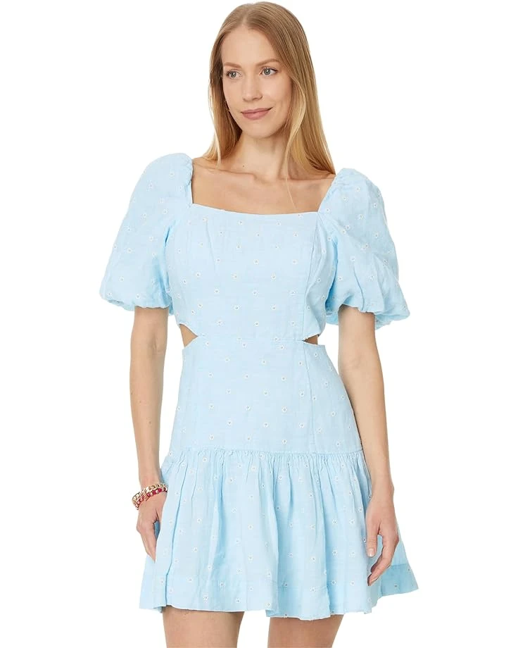 - Effortlessly chic and vibrant, the Lilly Pulitzer® Kylanne Elbow Sleeve Embr Linen Dress is a masterpiece of modern elegance. Featuring intricate embroidery embellishments, a flattering square neck, and a zippered back closure, this fit-and-flare dress with waist cut-outs and a tall ruffle at the hem exudes playful sophistication.