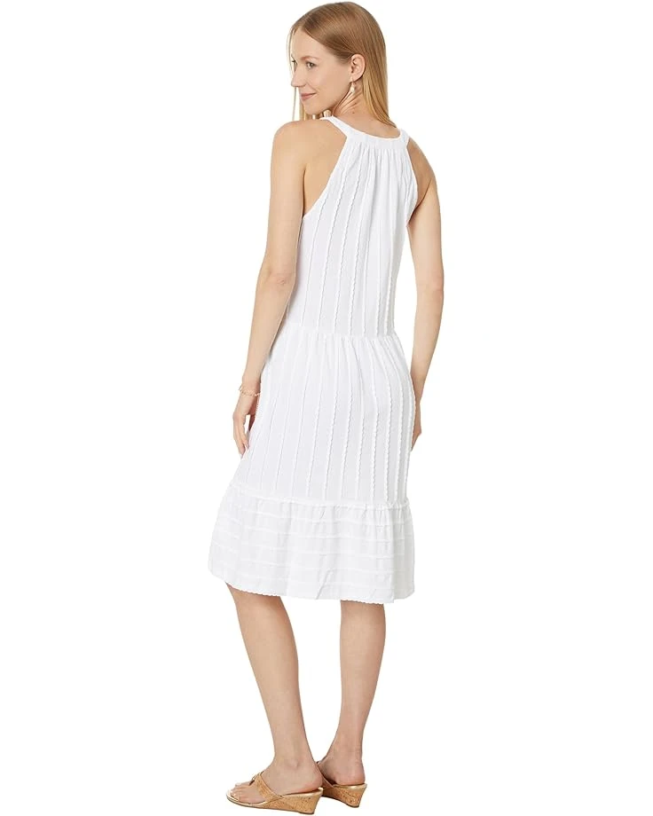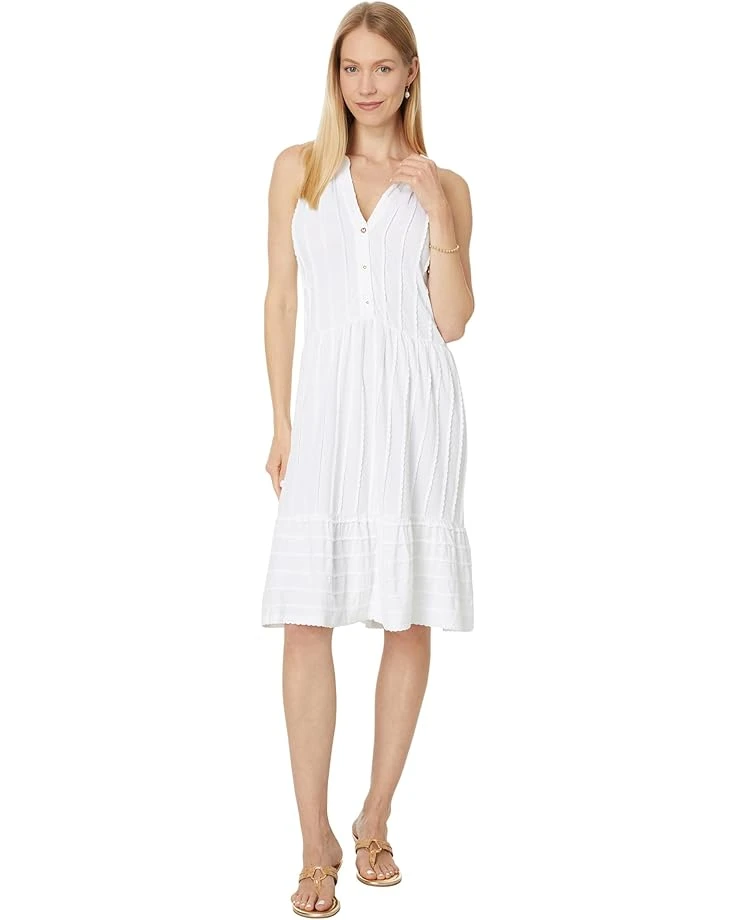 - The Lilly Pulitzer® Lennox Dress is styled with a notch neckline, cut-in armholes, and a buttoned front placket with gold buttons. This sleeveless dress is made from lightweight and breathable cotton that offers all-day comfort. The tiered hem and allover pleating detail add to its style. From casual parties to events, flaunt your great style wearing this cotton dress.