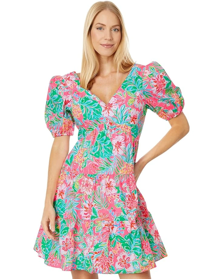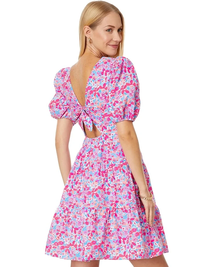 - Experience the luxurious softness and versatility of the Lilly Pulitzer® Nalani Short Sleeve Cotton dress. This easy breezy dress features a fit-and-flare silhouette. Crafted from breathable and light fabric this dress has a V-neckline with back cut-out detailing with functional tie closure.