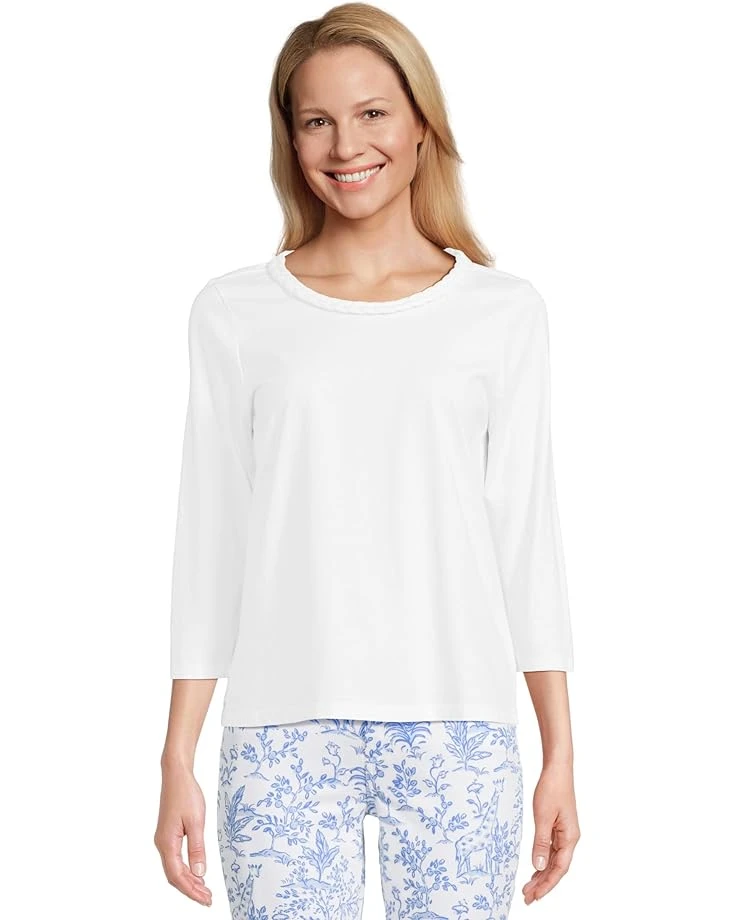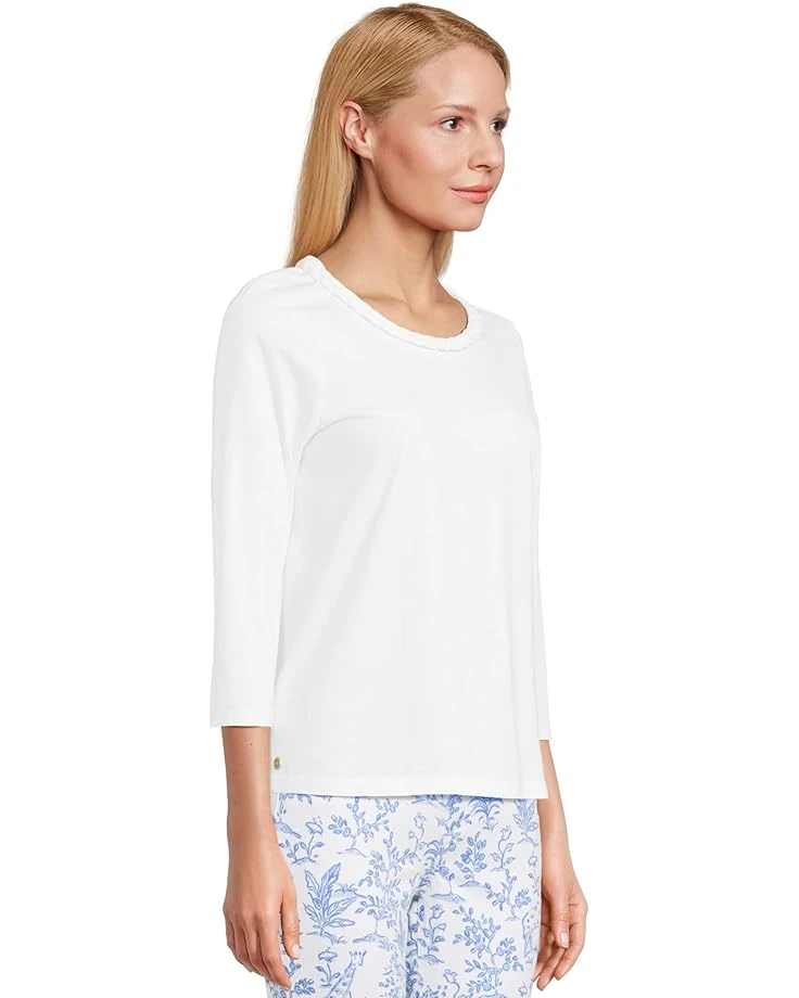 - Accentuate a sleek style wearing Lilly Pulitzer® Paulson Knit Top, crafted in a straight fit. The pull-on style top features a crew neckline, three-quarter sleeves, barnded hardware, and a braided trim.