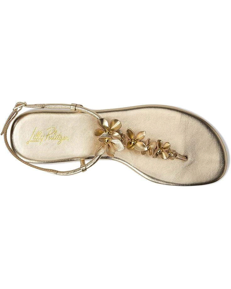 - The Lilly Pulitzer® Shelley Sandals are leather rosette embellished thong sandals with tubular straps. These flat sandals are made of a leather upper, plush padded footbed, leather insole, and leather lining. The adjustable buckle strap offers a secure fit. Match your party looks and casual outfits with these leather flats.