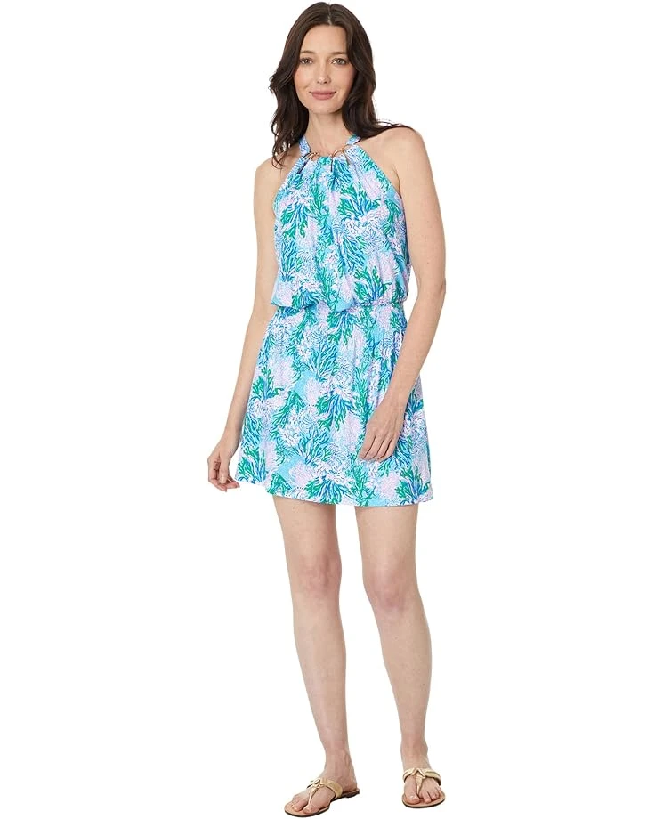 - Add a fun and colorful vibe to your look wearing the Lilly Pulitzer® Shirelle Skirted Romper. The Halter top skirted romper features a halter neckl with metal ring chain detailing at neckline, back neck tie, smocked waist, built-in shorts, allover floral printed pattern, and an above-the-knee silhouette.